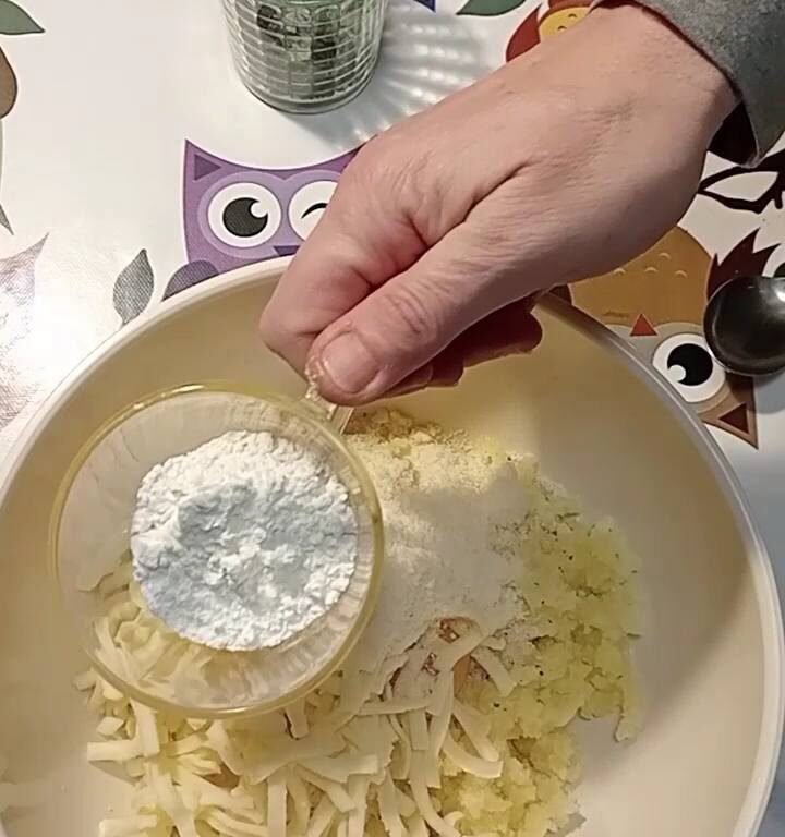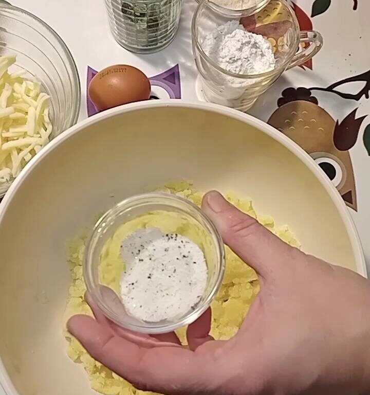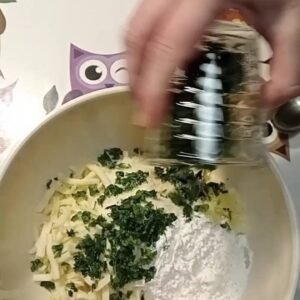 Aggiungi sale, pepe, l’uovo, la mozzarella a pezzetti, il parmigiano, la farina e il prezzemolo.