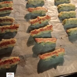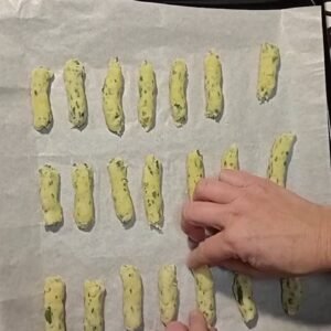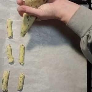 Rivesti una teglia con carta da forno e crea tanti bastoncini, sistemando le estremità con le mani.