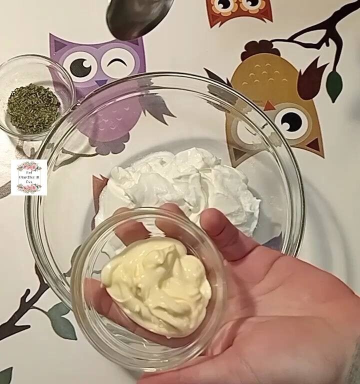 Nel frattempo prepara la salsa di accompagnamento: in una ciotola amalgama lo yogurt greco con la maionese, l’erba cipollina e l’aglio in polvere.